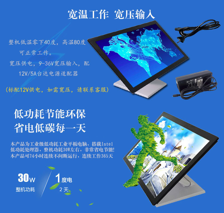 整機配置19寸寬溫、高亮度LED液晶顯示屏,超薄型設計,集成工業級低功耗嵌入式主板,支持SSD、HDD,具有多個I/O接口,電阻式觸摸屏; 19寸LED顯示屏,并具有待機節能模式,支持定時開關機功能。