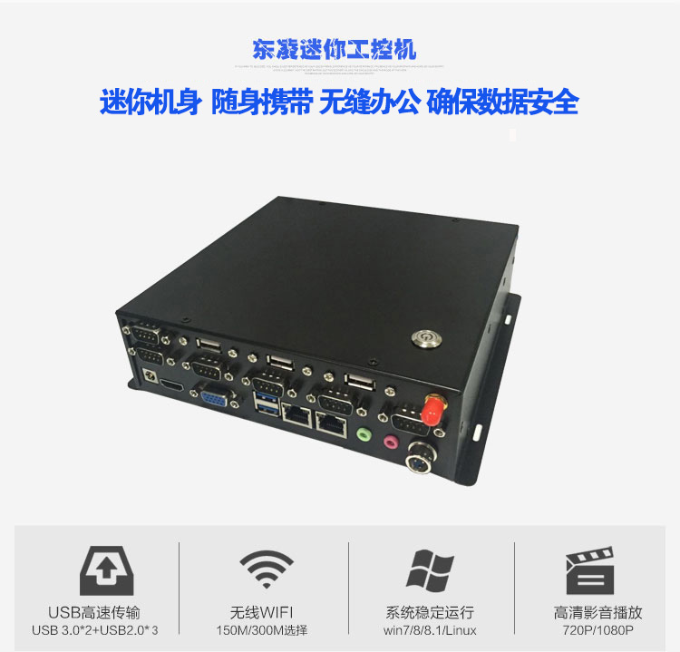這款產品是由賽揚J1900四核處理器,無風扇設計,配置2G內存(可升級),搭載32G固態硬盤(可升級),預裝win7  32位系統的標準配置,外置6個RS-232串口(RS-485),其中還有5個USB接口(有兩個是USB3.0高速接口),雙RJ45網口,可選配WiFi模塊以及9~36v寬壓模塊,可添加4G模塊,適用于各種物聯網設備控制,居家、工業、辦公等好幫手。