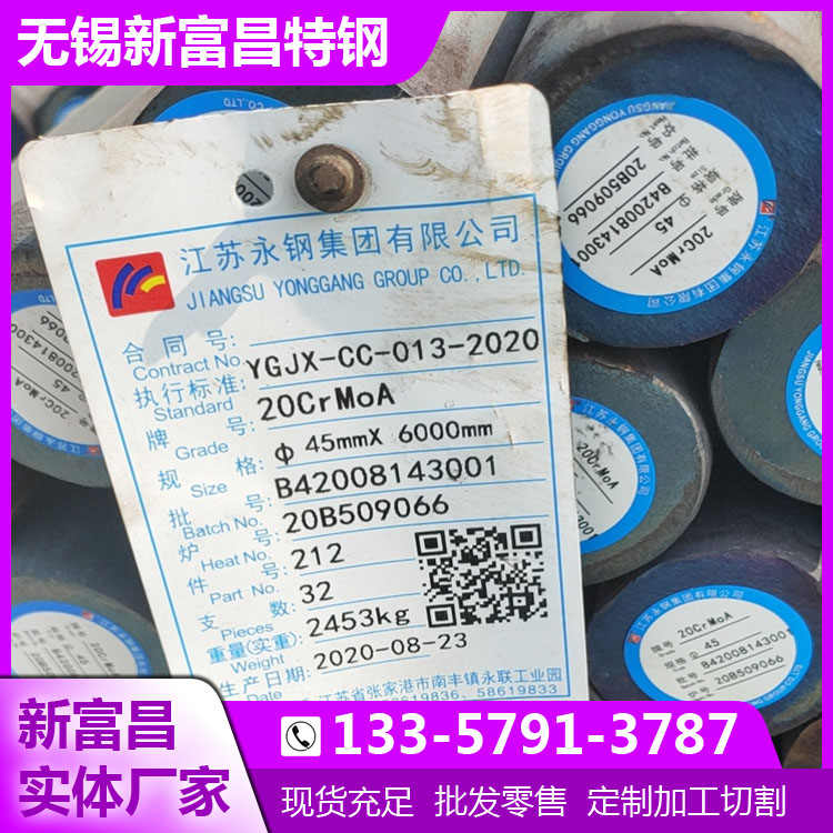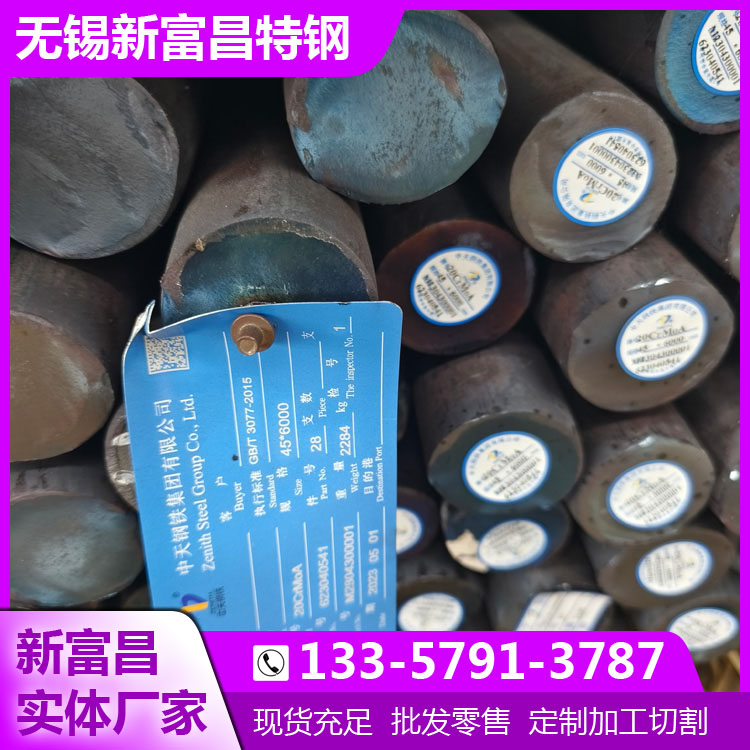 無錫新富昌主營ABC圓鋼、20CrMo圓鋼、30CrMo(4130)圓鋼、35CrMo圓鋼、42CrMo(4140)圓鋼;15CrMo圓鋼、12Cr1MoV圓鋼、38CrMoAl圓鋼、38CrSi圓鋼、9Cr2Mo圓鋼、27SiMn圓鋼、20Cr圓鋼、40Cr圓鋼;Q355E圓鋼、Q355D圓鋼、Q355B(16Mn)圓鋼;20CrMnTi圓鋼、30CrMnTi圓鋼、16MnCr5H圓鋼、20MnCr5H圓鋼、19CrNi5H圓鋼(19CN5H)、20CrMoH圓鋼、18CrNiMo7-6圓鋼(老牌號17CrNiMo6、國標17Cr2Ni2Mo)、SAE4320H圓鋼(20CrNi2MoA);25Cr2MoV圓鋼、25Cr2Mo1V圓鋼、20Cr1Mo1VTiB圓鋼、20Cr1Mo1VNbTiB圓鋼、20Cr3MoWV圓鋼、21Cr12MoV圓鋼(2Cr12MoV舊牌號)、1Cr11MoV(14Cr11MoV舊牌號)、2Cr12NiMo1W1V圓鋼、22Cr12NiWMoV圓鋼(C422、616,舊牌號2Cr12MoWV)、2Cr11Mo1NiWVNbN圓鋼、10Cr11Co3W3NiMoVNbNB圓鋼、A193 B16(40CrMoV)圓鋼、31CrMoV9(31Cr3MoV)圓鋼、35VB圓鋼;20CrNiMo(8620H)圓鋼、30CrNiMo8(30Cr2Ni2Mo)圓鋼、SAE4340(40CrNi2Mo)圓鋼、40CrNiMo圓鋼、45CrNiMoV圓鋼,30CrMnSiNi2圓鋼、30CrMnSi圓鋼、35CrMnSi圓鋼、20CrMnMo圓鋼、20CrMnMoH圓鋼、40CrMnMo圓鋼、12CrNi3圓鋼、12Cr2Ni4圓鋼、20CrNi3圓鋼、20Cr2Ni4圓鋼、18Cr2Ni4W圓鋼、34CrNiMo6(34Cr2Ni2Mo)圓鋼、34CrNi3Mo圓鋼;65Mn彈簧鋼、60Si2Mn彈簧鋼、60Si2CrVA彈簧鋼、50CrVA彈簧鋼;GCr15軸承鋼、GCr15SiMn軸承鋼;Cr12模具鋼、Cr12MoV模具鋼、CrWMn模具鋼、H13(4Cr5MoSiV1、SKD61)模具鋼、3Cr2W8V模具鋼、5CrNiMo模具鋼、5CrMnMo模具鋼、9CrSi模具鋼;W18Cr4V(W18)高速鋼、W6Mo5Cr4V2(M2、簡稱:W6或6542)高速鋼、W6Mo5Cr4V2Co5(M35)高速鋼、W2Mo9Cr4VCo8(M42)高速鋼;Y15(1215)易切削鋼、Y15pb(12L14)易切削鋼、Y40Mn(1144)易切削鋼、F45MnVS非調質鋼;A105圓鋼、T10A圓鋼、Q235圓鋼、10#圓鋼、20#圓鋼、25#圓鋼、35#圓鋼、45#圓鋼、55#圓鋼、60#圓鋼等特種鋼材。