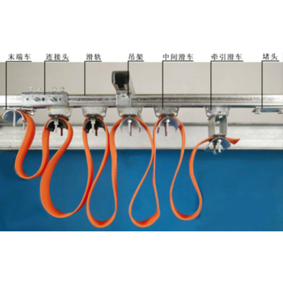 電纜滑線的工作原理見工程應用圖示,扁平電纜的始端(接現場接線盒)固定于導軋的始端固定器上,再根據現場允許運行的空間,間隔適當的長度(1-2.5mm)依次固定在攜帶電纜的四輪臺車上,電纜未端(接用電源)定在一個小車(牽引車)上。通過拔車上的彈簧拔小車往復移動,通過電纜的拖拽(長度如超過20m應考慮原用牽引繩,使電纜免受拉力)作用,帶動所有的小車在軋道中任意速度自由滑動,電纜滑線導軌安裝簡便,無需調試,且無觸點接觸供電等優點,安全可靠.