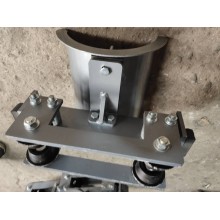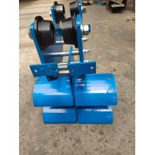 TB-GZG型滑車由牽收引滑車、電纜滑車、末端滑車三部分組成,牽引滑車跟隨移動機械導纜(牽引)裝置,每個移動機械配1個,隨移動機械往返運行。中間電纜滑車將電纜懸掛在工字鋼軌道范圍內隨牽引滑車移動,兩端并裝有緩沖裝置,滑車視移動長度不同而定數量。終端滑車固定在工字鋼導軌末端,一般每個移動機械設置1個。