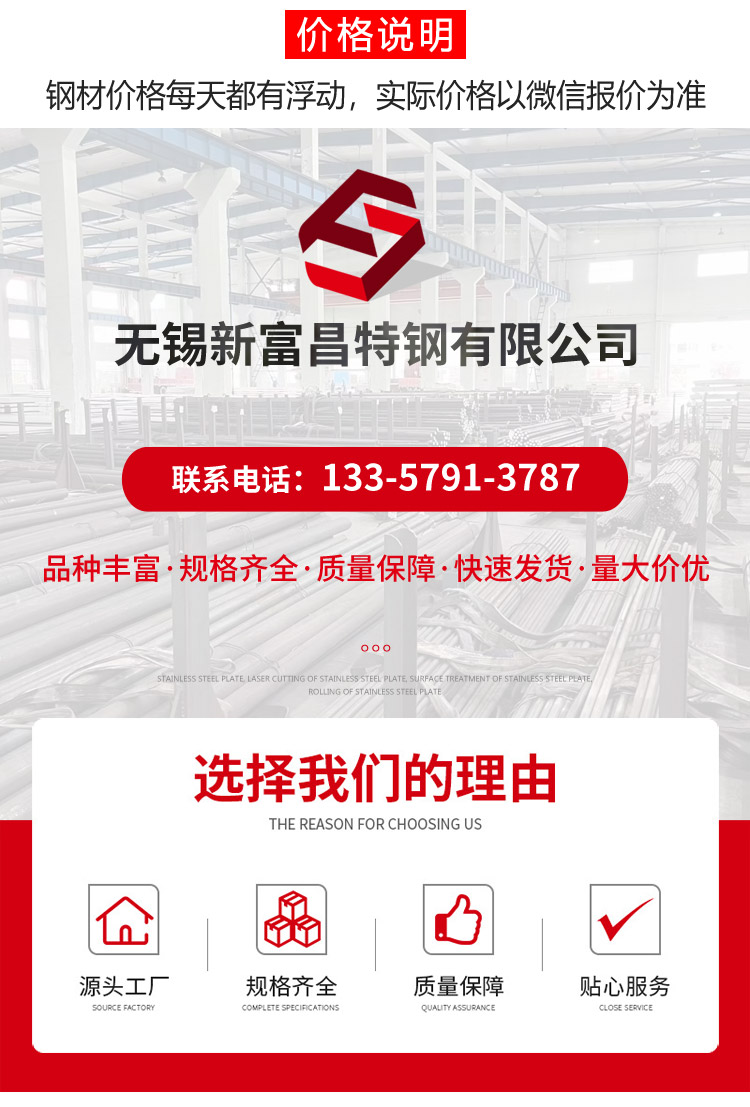 公司簡介   無錫新富昌特鋼有限公司專業經營各種進口、國產合金鋼、不銹鋼、碳鋼管材、板材、棒材、型材、管道配件等,為石油、化工和電力行業提供配套(管件)材料。是中國石油化工股份有限公司物資裝備部 的中國石化合金鋼管配送中心,中國石油天然氣集團公司一級供應網絡企業。常年經銷電廠、電站鍋爐耐高溫結構用鋼(12Cr1MoV鋼板;1Cr6Si2Mo鋼板),石油化工用耐高溫板(15CrMo鋼板;15CrMoR中溫容器板);耐腐蝕鋼,耐 腐蝕鋼(ND鋼)09CrCuSb、耐候鋼板09CuPcrNi-A、Corten-B鋼板;20G高壓鍋爐管,15CrMoG高壓鍋爐管,12Cr1MoVG高壓鍋爐管,美標A106B鋼管,SA210C鋼管,WB36鋼管,鋼研102磁...