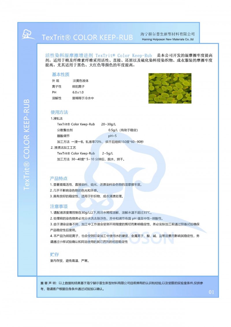 HOLPOSON? Color Keep-Rub是本公司開發(fā)的濕摩擦牢度提高劑,適用于棉及纖維素纖維采用活性、直接、還原以及硫化染料浸染織物、成衣服裝的摩擦牢度提高。尤其適用于黑色、大紅色等顏色的牢度提高。