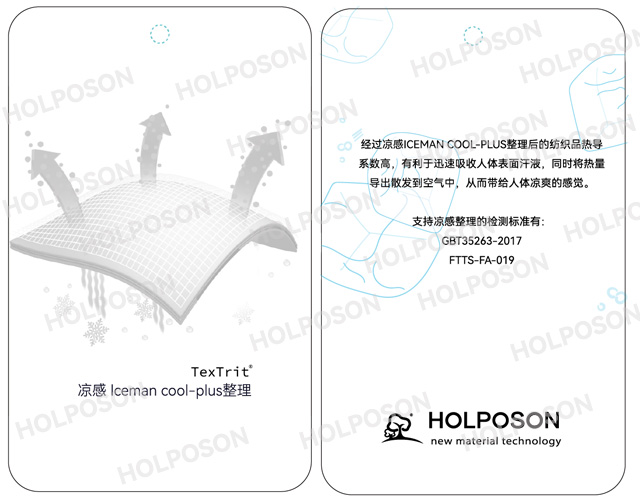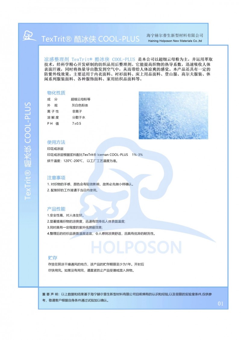 HOLPOSON? Iceman COOL-PLUS是本公司以超細云母粉為主,并運用萃取技術,經科學精心開發研制的紡織品用后整理劑。它能提高織物的熱導系數,迅速吸收人體表面汗液,同時將熱量導出散發到空氣中,從而帶給人體涼爽的感覺。本產品還具有一定的防紫外線效果。主要適用于內衣面料、襯衫面料、床上用品面料、登山服、高爾夫服裝、休閑系列服裝面料、各種服飾面料、家用紡織品面料等。
