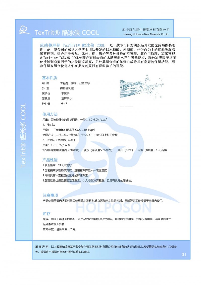 HOLPOSON?ICEMAN COOL也叫酷冰俠?是一款專門針對紡織品開發的涼感功能整理劑,是由我公司的東華大學博士團隊開發的以木糖醇,赤糖醇,絲蛋白為主的接觸吸濕涼感整理劑。適合用于天絲,冰絲,棉,滌綸等各種纖維的后整理。其作用原理:涼感整理劑HOLPOSON? ICEMAN COOL處理在面料表面的木糖醇遇水發生吸熱反應,釋放涼爽因子從而使接觸到涼爽因子的皮膚清涼舒爽,另外其所含有的絲蛋白成分具有良好的保濕功能,清涼保濕雙組合使得人們在炎炎的夏日有降溫防護的可能。