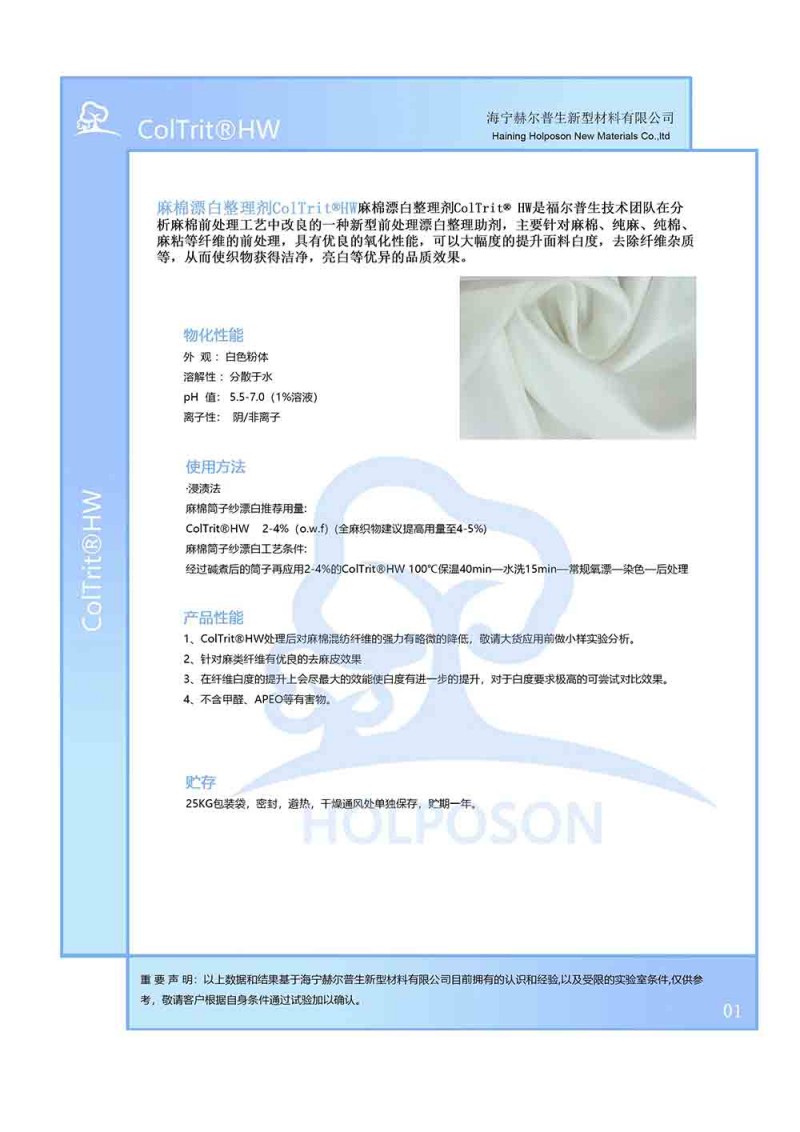 1、HOLPOSON?HW處理后對麻棉混紡纖維的強力有略微的降低,敬請大貨應(yīng)用前做小樣實驗分析。