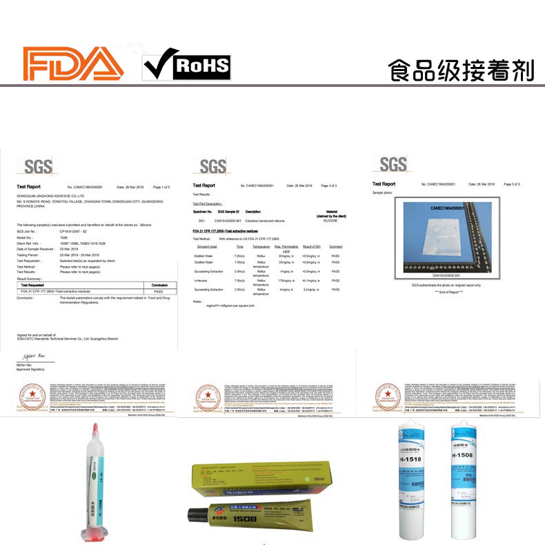 H-1508軟質(zhì)硅膠膠水適用:硅膠與PLA聚乳酸塑膠,等PP,ABS、PVC、PS、PC、PBE、PBT、PMMA、PPA等)、金屬(如鋼、銅、鋁、鐵)、鍍鋅、鍍鉻料、發(fā)泡料、尼龍布、紡織品、樹(shù)脂膠、皮革、海綿、石材、磁鐵、玻璃、竹木陶瓷等材質(zhì)間粘接與密封。產(chǎn)品以歐盟環(huán)保ROHS標(biāo)準(zhǔn),通過(guò)SGS檢測(cè)。1508通過(guò)FDA食品級(jí)檢測(cè).