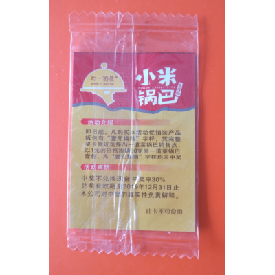 套袋刮刮卡(方便食品刮刮卡),有些食品里面需要放刮刮卡做有獎銷售活動,為了食品衛(wèi)生防止刮刮卡和食品直接接觸,就需要給刮刮卡套塑料袋,塑料袋是食品級的,可靠衛(wèi)生,避免刮刮卡上面的刮刮銀和油墨污染食品,影響健康。