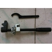 c:勾型扳手內鎖式,用手逆時針轉動調節手輪至手把處,移動卡軌座至調節手輪處,鉤鎖器鉤頭部位從鋼軌外側向內穿過,勾住道岔尖軌底部,移動卡軌座至鋼軌處,用手旋轉手輪至卡軌座,用勾型扳手扭緊,扭緊時手輪上凹槽處對準內鎖頂絲中心,用專用外六方螺絲刀扭緊,若需上二道鎖,可在卡軌座上上通用鎖,拆除時反方向操作即可。