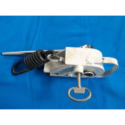 1.安裝:用專有鑰匙反時針打開內置棘爪,定位拉出鋼絲繩防溜器,卡槽卡在手閘座上,拉鉤掛在手閘鏈環上,順時針轉動制止用棘輪搬手擰緊既可。
