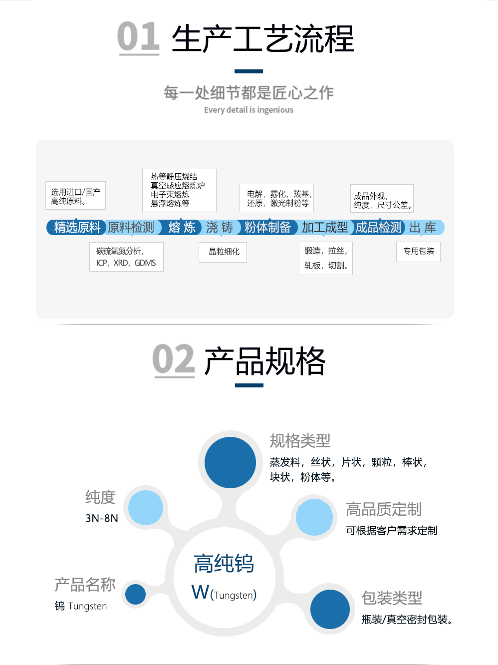 1、China New MetalCNM高純鎢(蒸發料,絲狀,片狀,顆粒,棒狀,塊狀,粉體)加工工藝流程