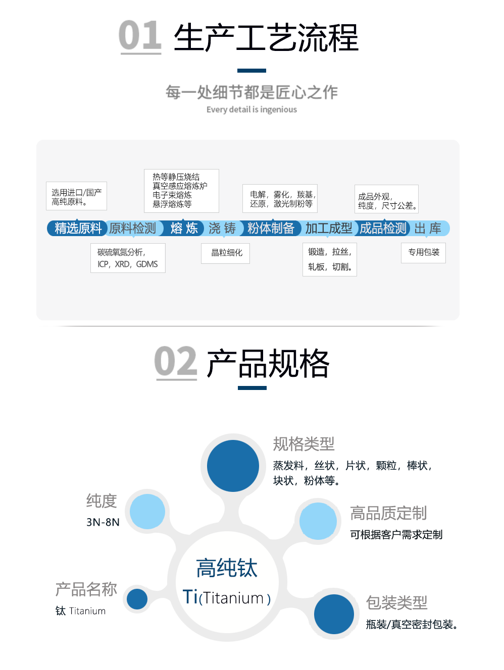 1、China New MetalCNM高純鈦(蒸發料,絲狀,片狀,顆粒,棒狀,塊狀,粉體)加工工藝流程