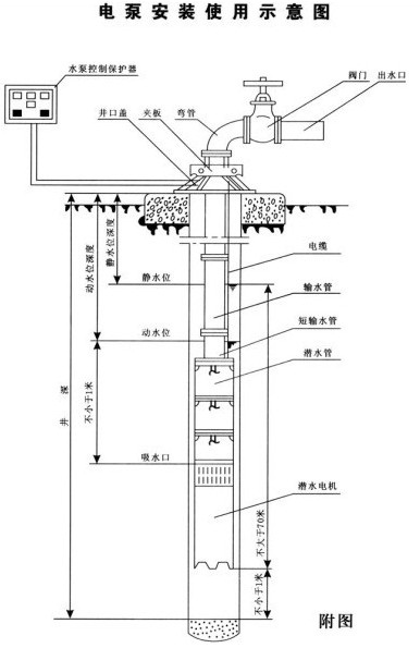 b) . 水泵進(jìn)水口必須在動水位1米位以下,但潛水不得超過靜水位以下70米,電機下端距井底水深在1米以上。