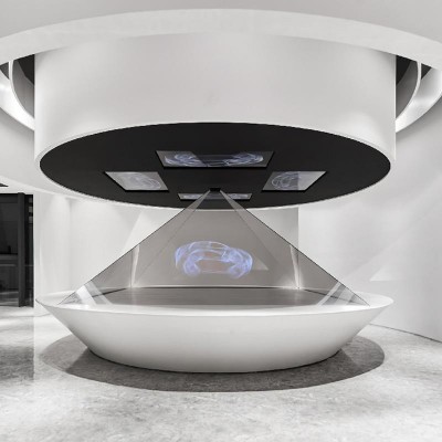 柜體時尚美觀,有科技感;頂部四面透明,空間成像;色彩鮮艷,對比度,清晰度高;有空間感,感,形成空中幻象;中間可結合實物,實現影像與實物的結合;也可配加觸摸屏實現與觀眾的互動