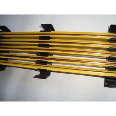 支架是由工程塑料制成的。可以組合排列成多極、能支撐滑線,防止滑線彎曲、折斷。支架分為兩種,一種支架中心距為12mm,另一種支架為14mm。支架在直線段,每隔0.8m裝一只,在彎道處每隔0.4m裝一只。