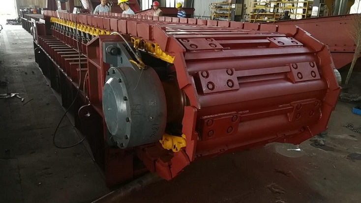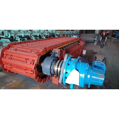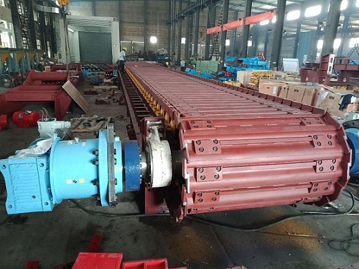 運載機構是中型板式給料機直接輸送物料的部分,主要由牽引鏈條和輸送鏈板(輸送槽)、輥輪組成。