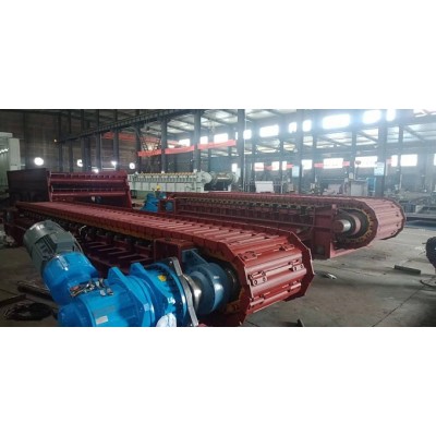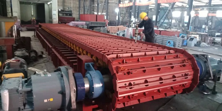 重型板式給料機主要部件包括主軸裝置、驅動裝置、運載機構(主要包括牽引鏈條、承載鏈板)、尾部鏈輪張緊裝置、機架、托輪及附屬設施等組成。