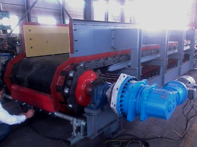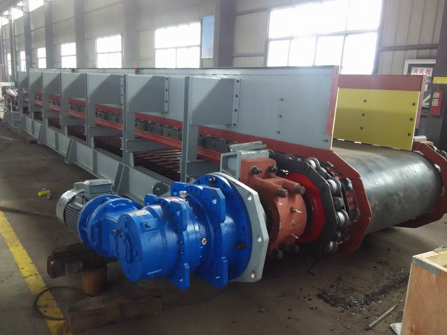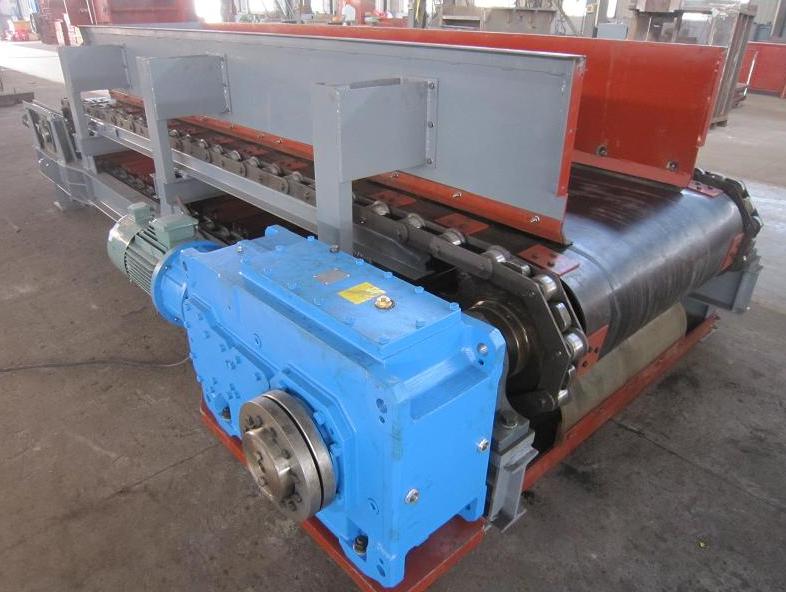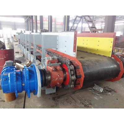 首先物料通過貯料倉流入至給料機(jī)輸送帶上,傳動裝置運(yùn)轉(zhuǎn),輸送動力至頭輪裝置,牽引輸送鏈、龍骨運(yùn)轉(zhuǎn),皮帶隨之運(yùn)轉(zhuǎn),物料流動,導(dǎo)料欄板攔阻、導(dǎo)向,將物料從給料機(jī)尾端輸送至頭端,通過頭罩卸至下道工序中的工作機(jī)械。位于頭輪下方的清掃裝置,清掃輸送帶表面的粘附物料,并卸至下道工序中的工作機(jī)械。傳動裝置可實(shí)現(xiàn)無級調(diào)速,調(diào)節(jié)輸送產(chǎn)量,從而滿足下道工序中的工作機(jī)械要求。
