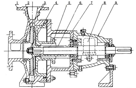 1-泵體  2-葉輪  3-密封環(huán)  4-葉輪螺母  5-泵蓋  6-密封部件  7-中間支架  8-軸  9-懸架部件