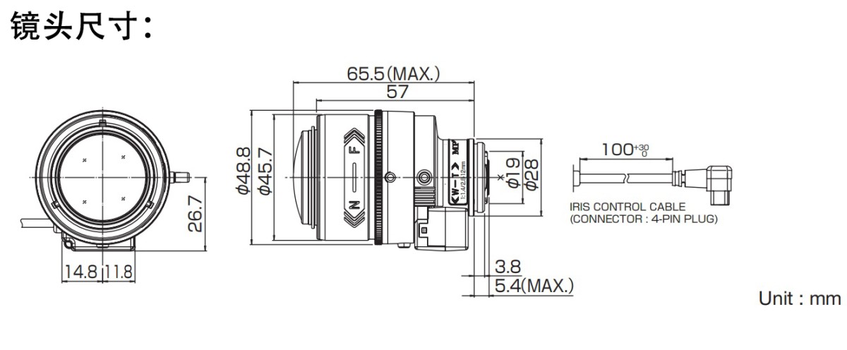 該鏡頭焦距為f: 2.8-12mm,是一款廣角(短焦)鏡頭,zui大廣角視角范圍為100°02(水平)×74°03′(垂直)、zui大遠望視角范圍為23°21′(水平)×17°36′(垂直),可提供超廣角視角范圍圖像