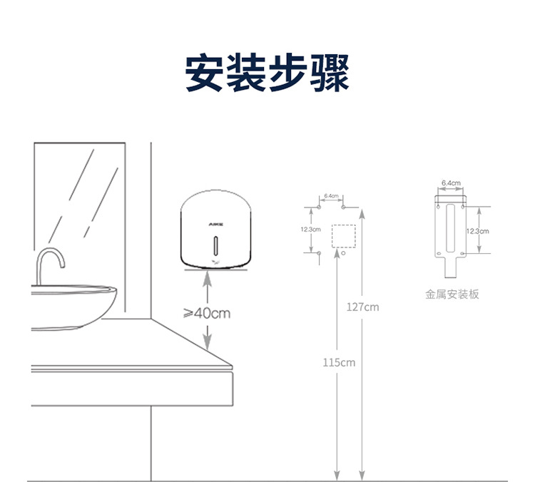 • 艾克(AIKE)不銹鋼高速干手器小空間烘手機免打孔壁掛