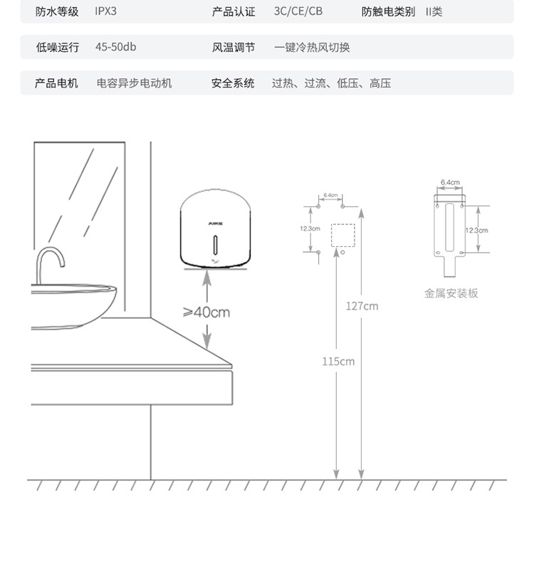 • 艾克(AIKE)高速干手器衛生間壁掛式自動烘手機干手機