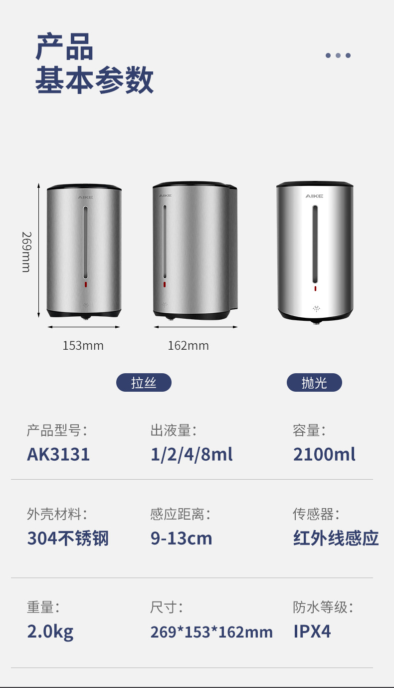 更新信息 快采購網供應商浙江艾克電器有限公司供應艾克(AIKE)不銹鋼酒精噴霧器手消毒器自動感應壁掛手部消毒機AK3131,為您提供詳細的產品報價、參數、圖片等商品信息,本產品于2025-10-17 08:48更新,主要更新內容為:產品類別、產品參數、產品價格、產品圖片等信息。如需進一步了解艾克(AIKE)不銹鋼酒精噴霧器手消毒器自動感應壁掛手部消毒機AK3131詳細信息,請與廠家直接聯系,并說明是在快采購網看到這條商機的。