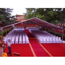 篷房主體框架為高強度特制鋁合金結構,重量輕,永不生銹;連接部位為采用國際焊接技術鋼結構,可調節式基座可彌補場地的不平,篷房采用雙層PVC合成纖維篷布,該篷布具有不拉伸,防紫外線的良好性能,不透光,防雨 、防火級別達到行業標準,采用高頻焊接技術,篷房抗風能力達到8 0-1 0 0公里/小時。單位組合式結構,可根據場地的大小自由增加,對搭建場地無特殊要求,一般平地如草地、大理石地、瀝青地面、水泥地等均可 。具有體積小、高強度、長壽命、穩定性,儲存方便,拆裝靈活、快捷易運輸等特點,安全性能可靠,符合歐洲質量和安全標準。現有篷房主要跨度有345、6、8、1 01 51 8、2 12 53040、50 米規格,可根據場地的大小尺寸可靈活快速搭建,篷房內部無任何支柱,場地得到充分使用。我們可以為您量身制作各式各樣的篷房并能為您的活動提供篷房各種的解決方案。