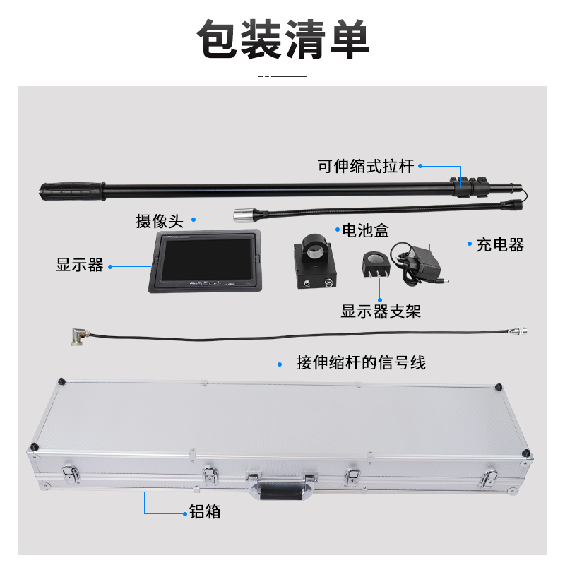 8.  攝像頭可調節角度:任意角度9.  攝像頭光源:12個高亮白光LED燈10. 攝像頭防水等級:IP6811. 攝像頭工作電壓:DC 12V,攝像機工作電流:100MA12. 伸縮桿總度長3.1米