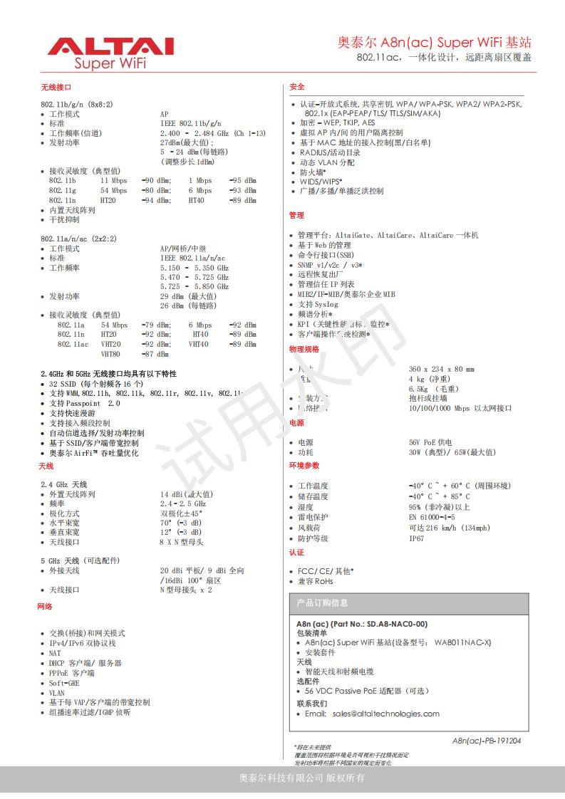 • 管理能力:通過 Altai 無線管理系統(tǒng)(AWMS)或 AltaiCare 平臺遠(yuǎn)程配置,支持 Web 管理、SSH 命令行、SNMPv1/v2c/v3,實時監(jiān)控 KPI、頻譜分析,實現(xiàn)高效運維。