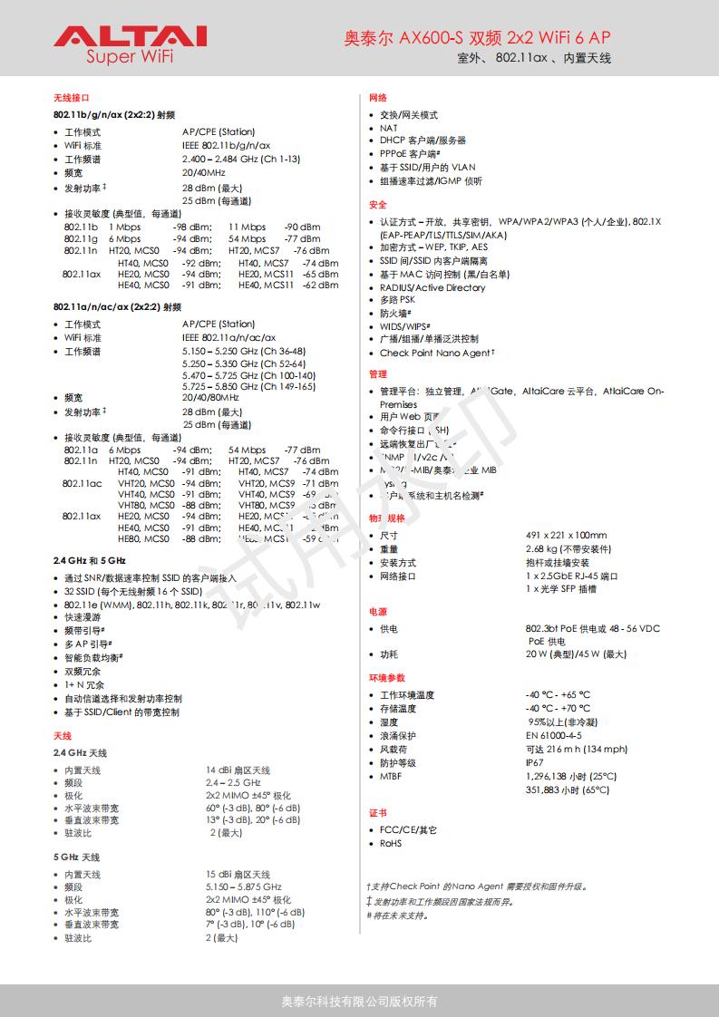 奧泰爾 AX600-S 是基于802.11ax(Wi-Fi 6)標準的雙頻 2x2 室外型接入點,內置高增益扇區天線,無需外接天線即可實現大范圍覆蓋。支持AP(接入點)CPE(客戶端)雙工作模式,總數據速率達1.775Gbps(2.4GHz 574Mbps+5GHz 1201Mbps),*大并發用戶數512 個,*遠視距覆蓋達3km(2.4GHz CPE)/2km(5GHz CPE),是智慧工業、城市基建及高密度場景的理想解決方案。