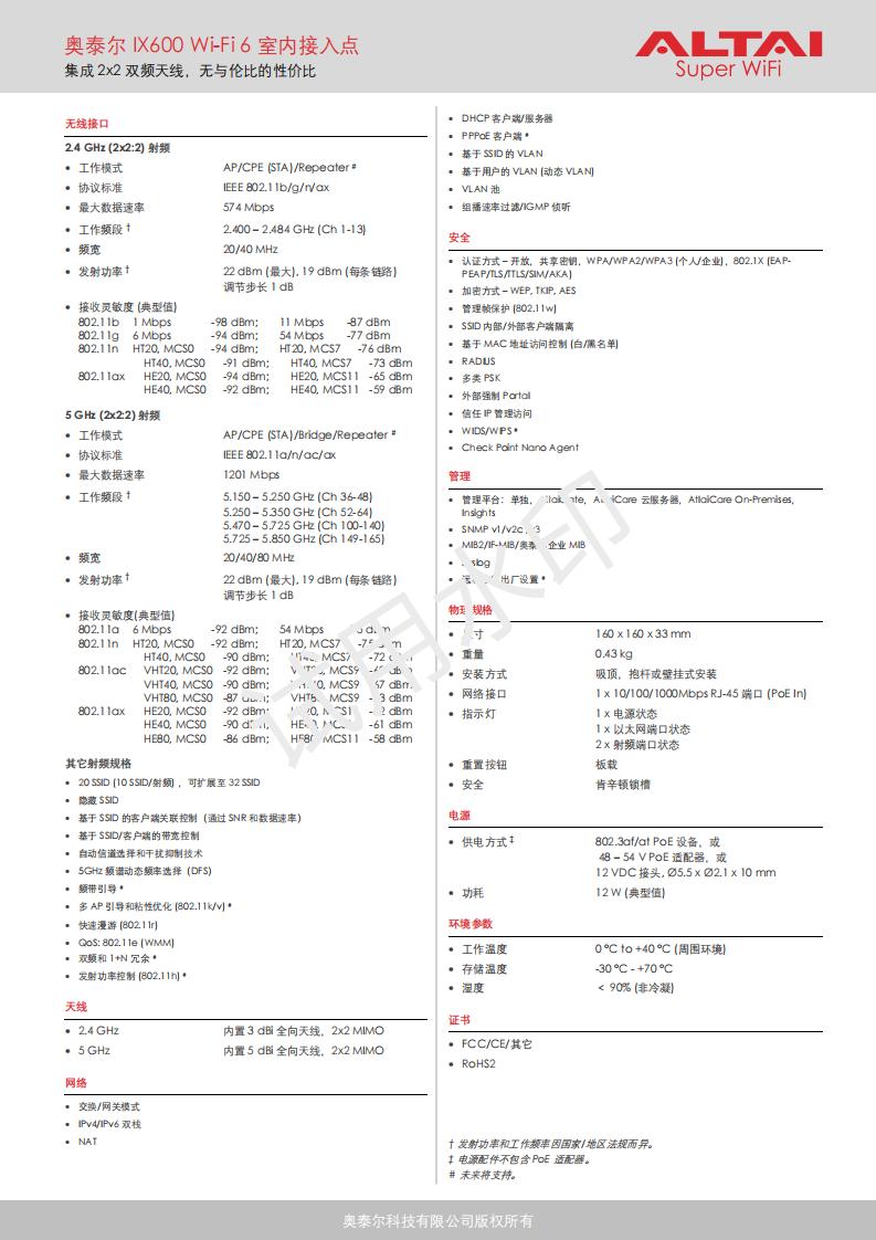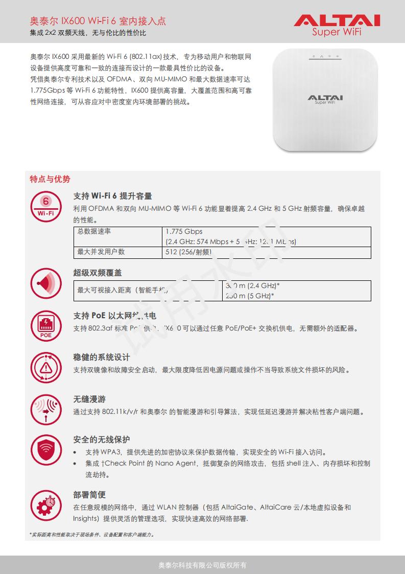 • 奧泰爾 IX600 室內(nèi) Wi-Fi 6 接入點 | 雙頻 1.775Gbps