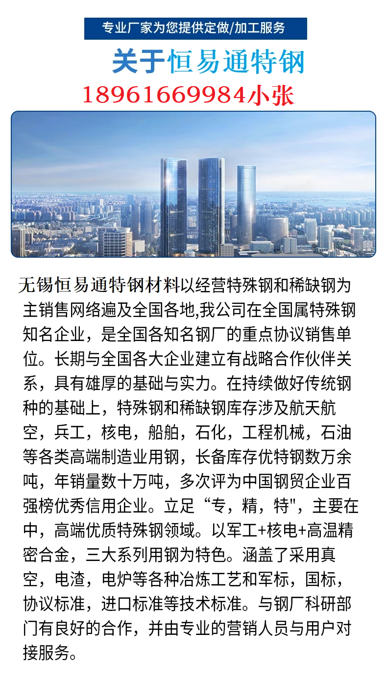 無錫恒易通特鋼材料有限公司主營42CrMo圓鋼、20Cr圓鋼、42CrMo圓鋼;16Mn圓鋼、Q425B圓鋼、Q425D圓鋼、Q425E圓鋼;15CrMo圓鋼、20CrMo圓鋼、30CrMo圓鋼、4130圓鋼、42CrMo圓鋼、 42CrMo圓鋼|42CrMo結構鋼圓鋼、 42CrMo圓鋼|42CrMo結構鋼4圓鋼、 42CrMo圓鋼|42CrMo結構鋼B7圓鋼、12Cr1MoV圓鋼、38CrMoAl圓鋼、27SiMn圓鋼;20CrMnTi圓鋼、30CrMnTi圓鋼、16MnCr5圓鋼、20MnCr5圓鋼;30CrMnSiA圓鋼、42CrMnSiA圓鋼、42CrMo圓鋼、SAE42CrMo圓鋼、42CrMoNiMo圓鋼, 42CrMo圓鋼|42CrMo結構鋼、25Cr2Mo1V圓鋼、20Cr1Mo1VNbTiB圓鋼、12CrNi3圓鋼、18Cr2Ni4WA圓鋼、17CrNiMo6圓鋼、34CrNiMo6圓鋼、20Cr2Ni4圓鋼、20CrMnMo圓鋼、42CrMoMnMo圓鋼;65Mn彈簧鋼、42CrMo彈簧鋼、50CrVA彈簧鋼;GCr15軸承鋼、GCr15SiMn軸承鋼;Cr12模具鋼、Cr12MoV模具鋼、H13模具鋼、CrWMn模具鋼、9CrSi模具鋼、3Cr2W8V模具鋼、5CrNiMo模具鋼、5CrMnMo模具鋼;W18Cr4V高速鋼(W18高速鋼)、W6Mo5Cr4V2高速鋼(M2高速鋼、簡稱:W6高速鋼或6542高速鋼)、W6Mo5Cr4V2Co5高速鋼(M42高速鋼)、W2Mo9Cr4VCo8(M42高速鋼);1215易切削鋼(Y15易切削鋼)、Y15pb易切削鋼(12L14易切削鋼)、1144易切削鋼;A3圓鋼、Q242圓鋼、10#圓鋼、42CrMo圓鋼、42#圓鋼、42CrMo圓鋼、55#圓鋼、A105圓鋼、T10圓鋼、40Mn2圓鋼、50Mn圓鋼等特種鋼材。