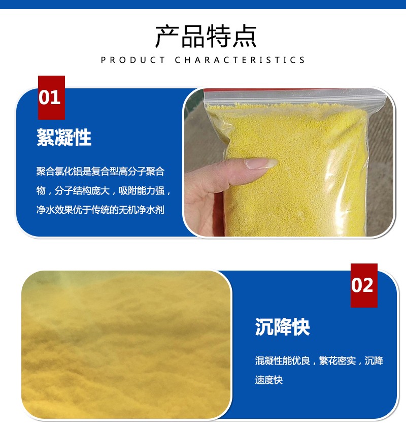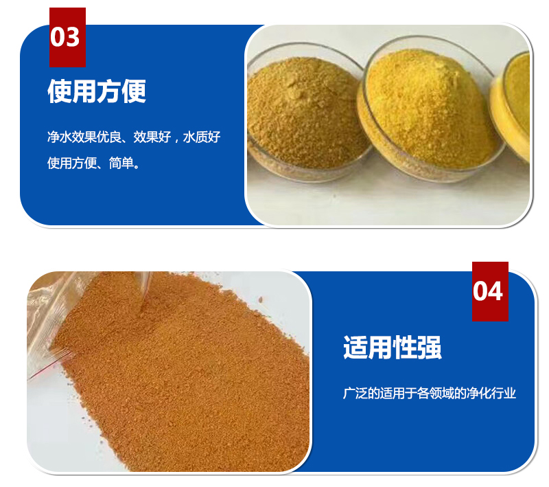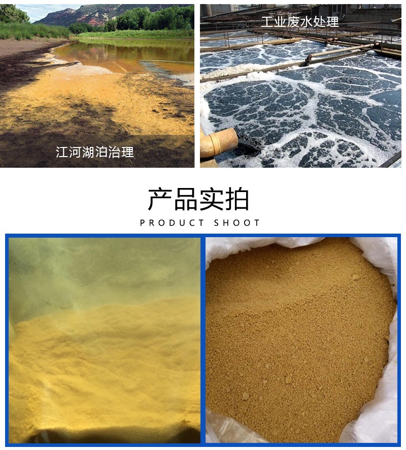 固體產品外觀為黃色粉末或褐色粉末,它是一種無機高分子混凝劑,通過壓縮雙層、吸附電中和、吸附架橋、沉淀物網捕等機理作用,使水中細微懸浮粒子和膠體粒子脫穩,聚集、絮凝、混凝、沉淀,達到凈化處理效果。