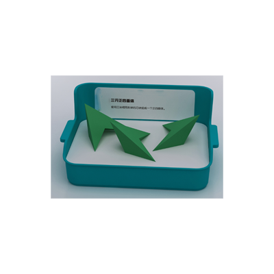 箱體:ABS一體注塑成型;整體圓潤,無棱角、銳角;分為上下兩層,下層儲物收納;可堆疊,方便運輸,兩側(cè)帶有把手,便于搬運;臺面采用耐磨、抗刮傷材料;說明牌置于展箱上層箱體內(nèi)側(cè),尺寸≥:300mm*100mm。由三個相同形狀的物塊組成,目標是形成一個正四面體,探究三元正四面體。
