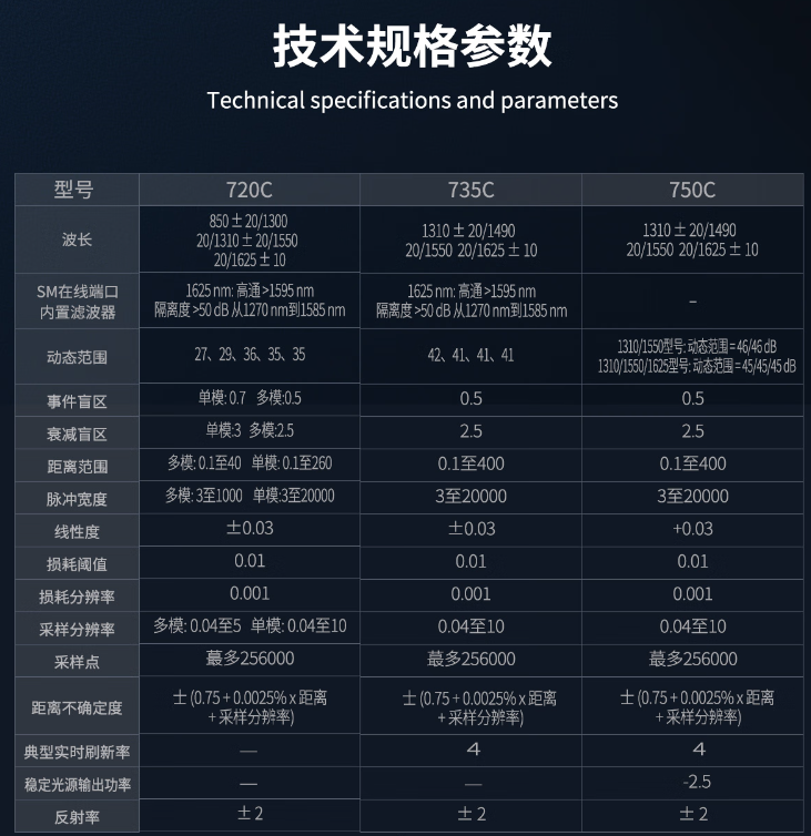 波長(nm): 850 ± 20/1300 ± 20/1310 ± 20/1550 ± 20/1625 ± 10