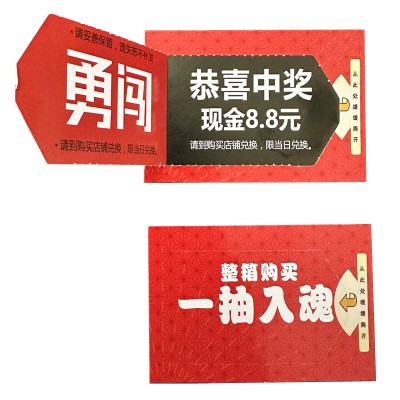 此刮刮卡為撕開式,獎項可以在背面,也可以在底層膠上,揭開式的刮刮卡類似于揭開式的防偽標簽,此類刮刮卡方便消費者兌獎,只要將其揭下來,其標的背面為獎項內容,可以憑此兌獎。