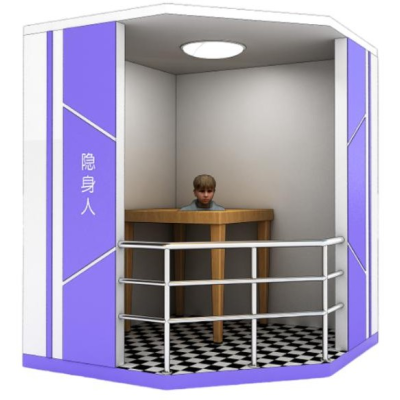 隱身人1.2*1.2*2.2m,展項主要是利用平面鏡的反射原理 ,使參觀 者不能看見周圍環(huán)境,隱藏參觀者的下身。 其實,桌子下面有兩面鏡子,鏡子對周圍的 影像反射后,從而使人們產(chǎn)生了“下面的身 體隱身”的錯覺。本展項需要兩個人一起互 動,一人到屋內(nèi)演示,一人在屋外觀看。 功能概述:這個展品利用平面鏡成像的原理 讓屋外的觀眾看不到屋內(nèi)的觀眾 ,由于鏡像 的原因屋內(nèi)觀眾的下半身被隱藏 ,外面的觀 眾只看到屋內(nèi)觀眾的脖子以上部分 ,就像是 放在桌子上的一樣,非常神奇。