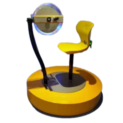 Φ1.5*1.4m;機械互動;觀眾坐上轉臺上的座椅,雙手握緊手柄開始用力轉動,座椅隨之轉動起來,此時順時針轉動輪子會在圓盤上產生一個角動量,根據角動量守恒定律,在相反的方向也會產生一個角動量。這個相反方向的角動量會對轉動的平臺產生作用力,使之按逆時針旋轉。