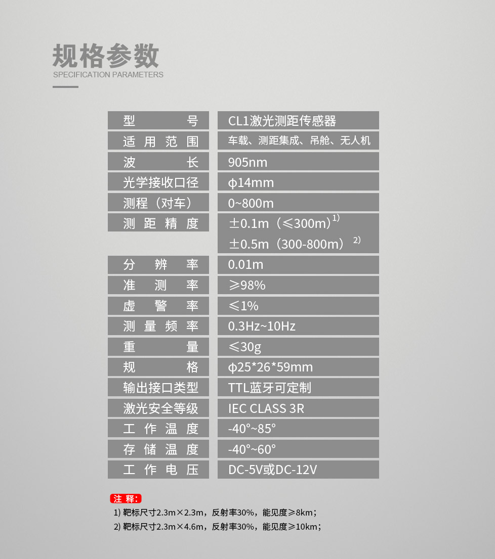 昕銳 CL1 激光測距模塊是昕銳至成自主研發的一款高性能測距產品,具有精度高、穩定性強、適應性好等特點,以下是具體介紹: 測距精度:采用動態濾波算法抑制環境噪聲,在 0-300 米范圍內精度可達 ±0.1 米。 尺寸規格:尺寸為 Φ25×59mm,體積小巧,便于集成到各種設備中。 接口方式:支持 RS422 接口,可直接兼容現有協議,還支持 TTL、藍牙等多種輸出模式,方便與不同設備連接,且提供 SDK 與協議文檔,降低二次開發成本。 供電方案:采用 5V 供電方案,有利于降低設備整體功耗。 環境適應性:工作溫度范圍為 - 40℃-+85℃,通過 72 小時高低溫循環測試,還通過了 5G 振動測試,可適配車載、無人機等動態場景,能在多種復雜環境下穩定工作。 應用場景:可嵌入前向雷達,支持障礙物檢測與自動剎車,適用于工業自動化等領域,也可應用于安防監控等場景。