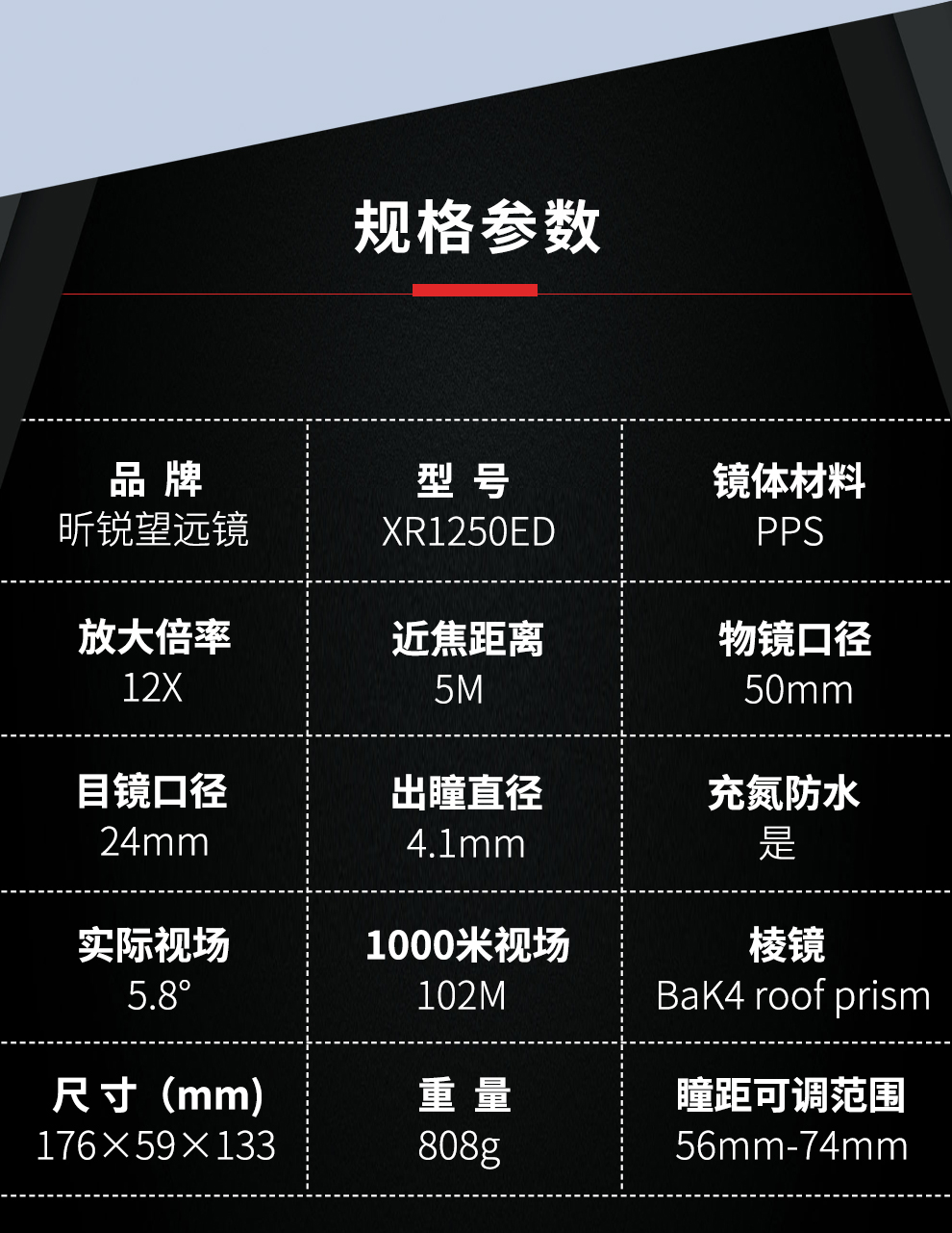 昕銳 XR1250ED 是一款雙筒望遠鏡,適合戶外觀測、演唱會觀看等場景,具有高清成像、充氮防水等特點,以下是具體介紹: 光學參數:放大倍率為 12X,物鏡直徑 50mm,視場范圍為 5.8°,在 1000 米處視野可達 102m。出瞳直徑 4.1mm,出瞳距離 18mm,近焦距離為 5m,能提供清晰穩定的觀測效果。 鏡片與鍍膜:采用 ED 鏡片,可有效解決光學鏡頭產生的色散、色差問題,高度還原畫面真實色彩。物鏡和目鏡采用 SMC 酒紅色鍍膜,成像高清,畫面色彩更清晰。棱鏡為 BaK4 材質,配備電介質膜和相位膜,進一步提升圖像質量。 調焦設計:調焦方式為中軸調焦,調焦輪加大并采用防滑設計,調節更輕松,對焦更精準,目標鎖定更快速。還可通過微調右側視差補償輪,使雙眼得到完美清晰影像。 結構設計:鏡體材料為 PPS,膠皮材料為橡膠(NBR+PVC),堅固耐用且握持舒適。采用旋升眼罩,旋起適用佩戴眼鏡者觀測,旋下適用裸眼觀測。瞳距可調范圍為 56mm-74mm,視度可調范圍為 - 4 To +4 Diopter,能適應不同用戶的使用需求。 防水性能:具備充氮防水功能,可在一定程度上防止鏡片起霧和長霉,能適應多種戶外環境。 尺寸重量:尺寸為 176×59×133mm,重量為 808g,較為便攜,方便用戶攜帶外出使用。