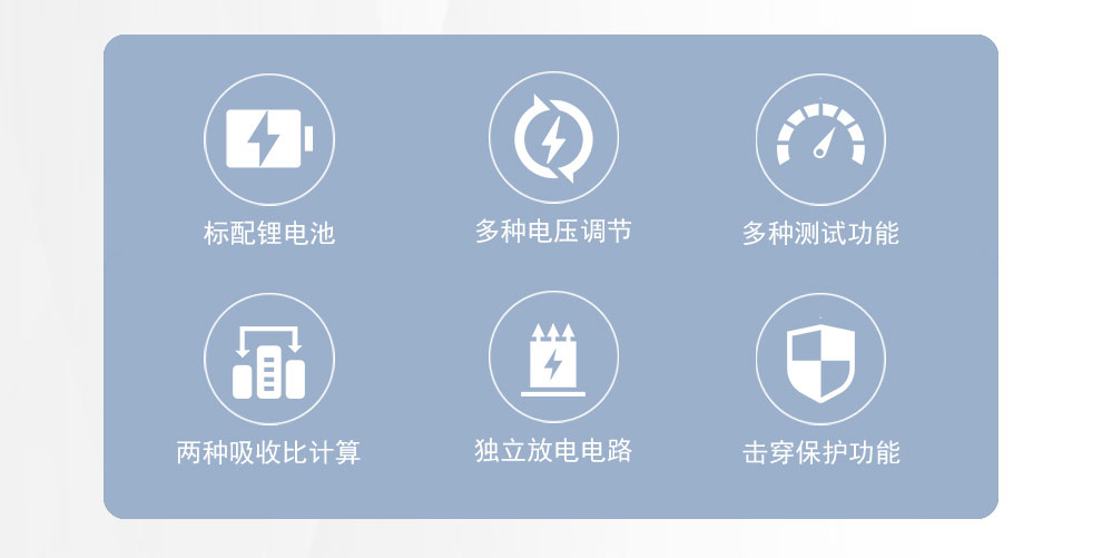 2. 具備6個(gè)固定電壓量程:100V、250V、500V、1000V、2500V、5000V。自定義電壓模式50V~5000V連續(xù)可調(diào),步進(jìn)電壓10V。