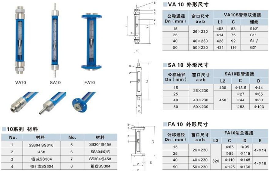 LZB-VA/SA/FA10系列玻璃轉子流量計與同類產品比較具有測量精度高,互換性好,連接方式多等優點。連接方式有LZB-VA10管螺紋連接,LZB-SA10軟管連接,LZB-FA10法蘭連接(活套法蘭結構)。