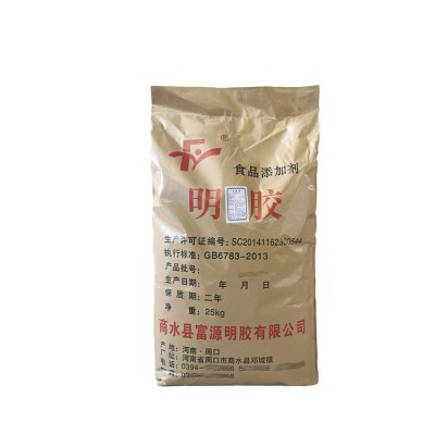 【包裝、貯存】明膠采用紙塑復合袋包裝,包裝規格為每袋 25kg 。明膠應密封貯藏于干燥、通風、陰涼處、不得露天堆放,防止受潮、受熱和曝曬。常溫下保質期為2年。