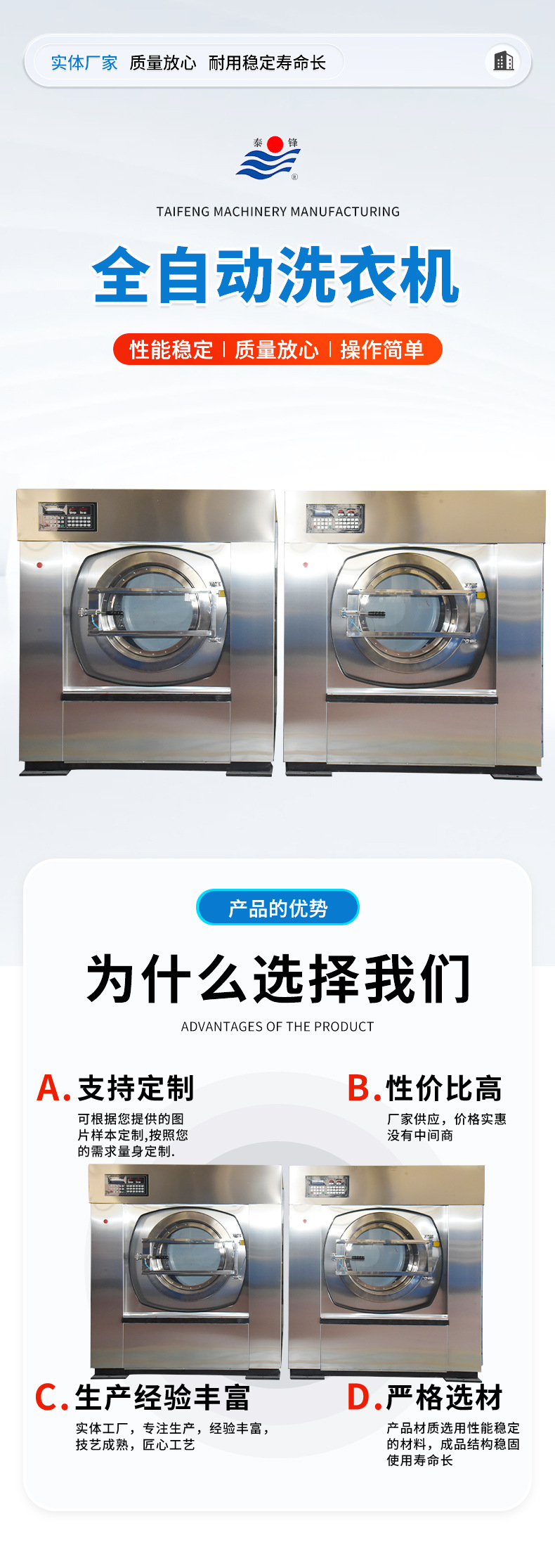 公司簡介 江蘇泰鋒機械制造有限公司是輕工機械協(xié)會會員單位,江蘇省名優(yōu)企業(yè),地處江蘇省泰州市高新技術(shù)開發(fā)區(qū);注冊資本4520萬人民幣;致力于洗滌技術(shù)的研發(fā)和制造,為用戶提供優(yōu)質(zhì)的工業(yè)洗滌設(shè)備。專業(yè)生產(chǎn)工業(yè)洗衣機、全自動洗脫機、自傾式全自動洗脫機、衛(wèi)生隔離式洗衣機、脫水機、烘干機、熨平機、干洗機、折疊機、送布機等,廣泛應(yīng)用于賓館、水洗房、酒店、紡織、服裝及洗滌行業(yè)。 公司專注于中國洗滌行業(yè)發(fā)展,不斷學(xué)習(xí)和吸取國內(nèi)外先進技術(shù),在洗滌設(shè)備設(shè)計制造方面積累了豐富的經(jīng)驗。憑借豐富的制造經(jīng)驗、完善的售后服務(wù)體系、不斷的創(chuàng)新精神,國內(nèi)外客戶的一致好評。熱忱歡迎國內(nèi)外客商...