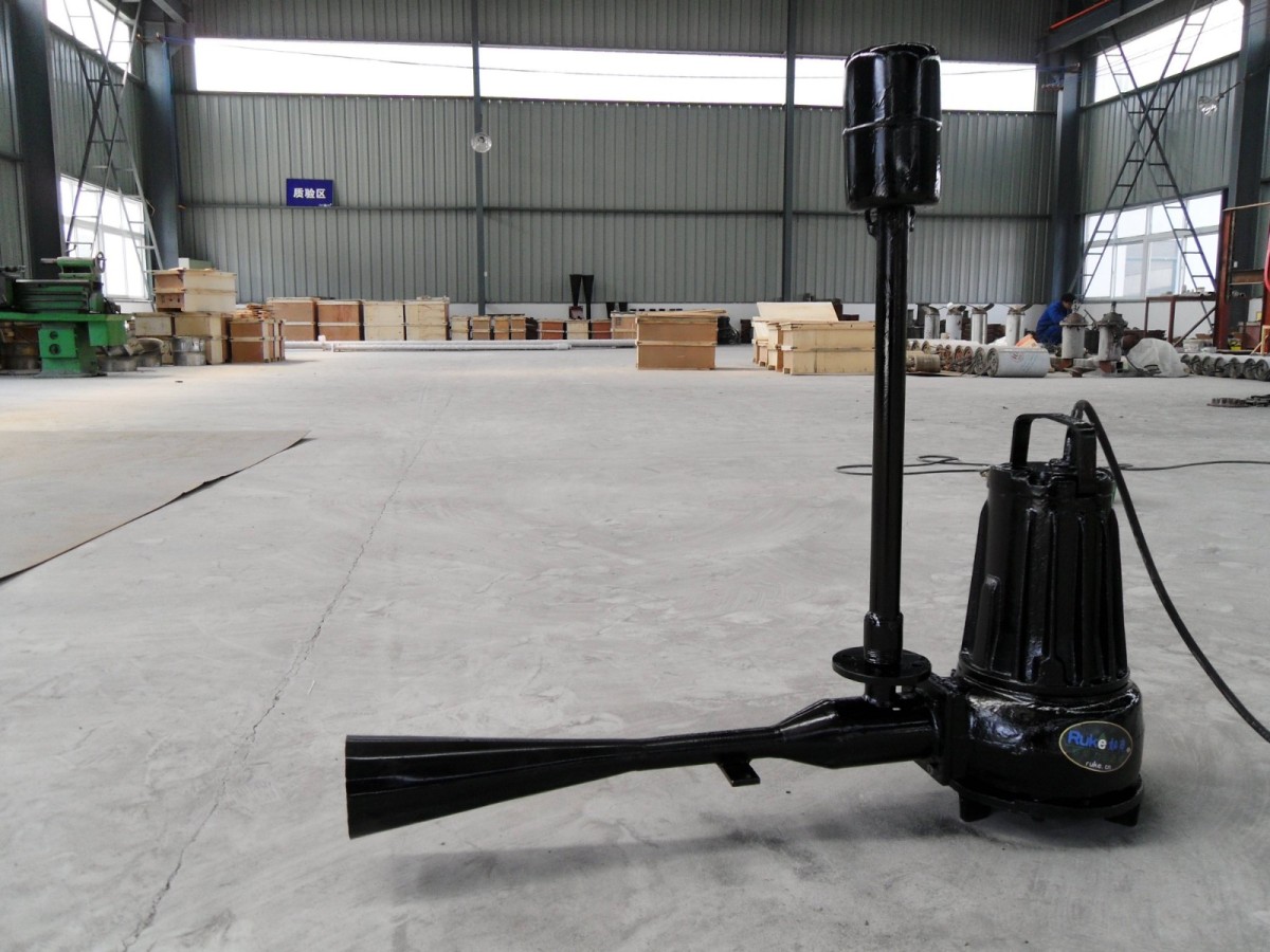 特點: 該曝氣機由潛水電泵與噴射泵組成,從而使水體攪動與充氧同時進 行,既可獲得較高的氧氣吸收率,又具有葉輪無堵塞優點。