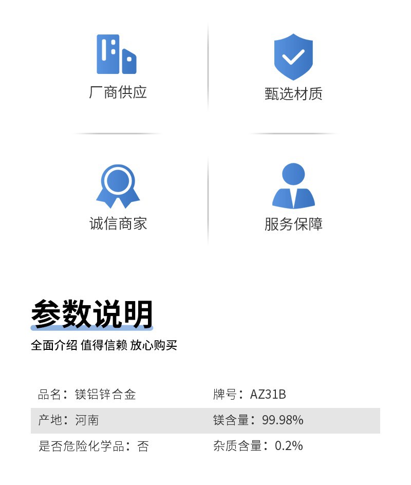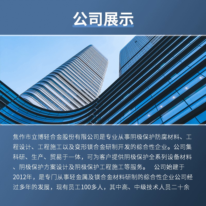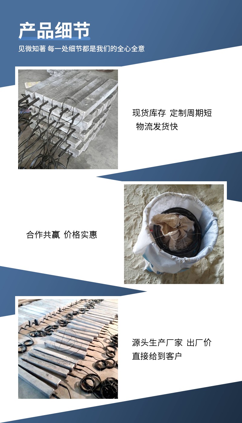 熱銷產品 鎂合金犧牲陽極系列、鋁合金犧牲陽極系列、鋅合金犧牲陽極系列、以及陰極保護配套產品等十幾個品種和上百種規格