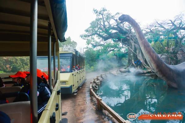 該場地仿照了侏羅紀時期熱帶雨林風(fēng)格建造,給大家營造了身臨其境的環(huán)境。大家s先坐上專屬列車,來到雨林深處,隨后排好隊伍開始徒步。