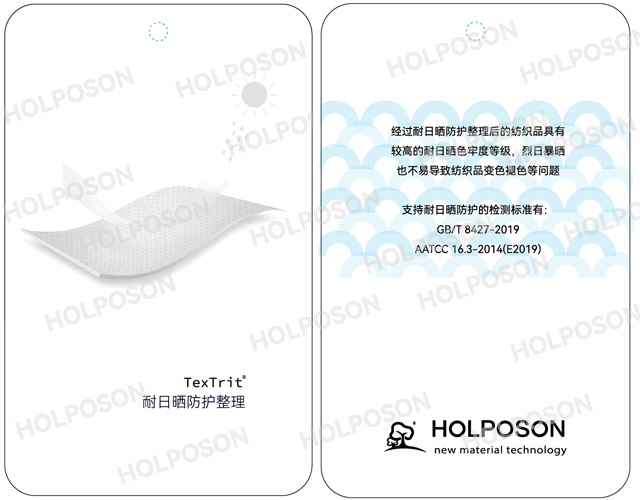 耐日曬牢度整理劑HOLPOSON? Color Keep-Sun 隨著人們生活水平的提高,對于一些裝飾材料的耐日曬牢度要求越來越高,尤其是家用的窗簾、汽車內部的坐墊及戶外帳篷等材料,我司RST 主要是為提高滌綸、棉、皮革等面料的耐日曬色牢度而研發的產品,整理后的面料,具有優異的耐日曬效果,可提升色牢度1級左右。