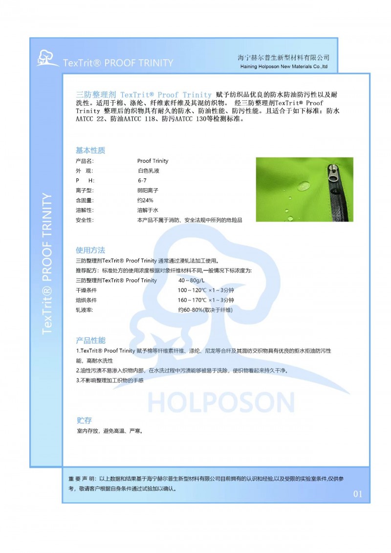 HOLPOSON? Proof Trinity 賦予紡織品優良的防水防油防污性以及耐洗性。適用于棉、滌綸、纖維素纖維及其混紡織物。 經三防整理劑HOLPOSON? Proof Trinity 整理后的織物具有耐久的防水、防油性能、防污性能。且適合于如下標準:防水AATCC 22、防油AATCC 118、防污AATCC 130等檢測標準。